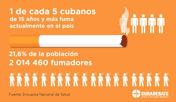 - Uno de cada cinco cubanos de 15 años y más fuma actualmente en el país. Ello equivale al 21,6 % de la población, lo cual representa 2 millones 014 mil 460 cubanos, según resultados de la Encuesta Nacional de Salud que concluyó en diciembre del año 2019.