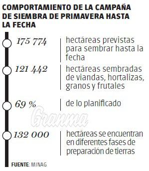 Tanto la pasada campaña de siembra de frío 2020-2021 como la actual de primavera han estado condicionadas por eventos climatológicos adversos, atrasos en las siembras y pocas entregas en las asignaciones de combustibles, así como por la falta de fertilizantes. Aun así, en la siembra de frío, por ejemplo, se planificó plantar 376 882 hectáreas y se concretaron 384 370.